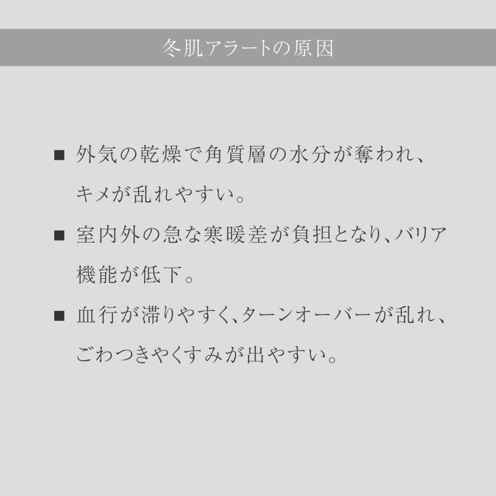 とろみのあるテクスチャーが角質層のすみずみまで穏やかに浸透し、潤いを届けます。少量でも、吸いつくようなもちもちの肌触りに。お手入れの最初である化粧水でしっかり保湿して肌を柔らげることで、潤いに満ちた輝かしい肌へと導きます。