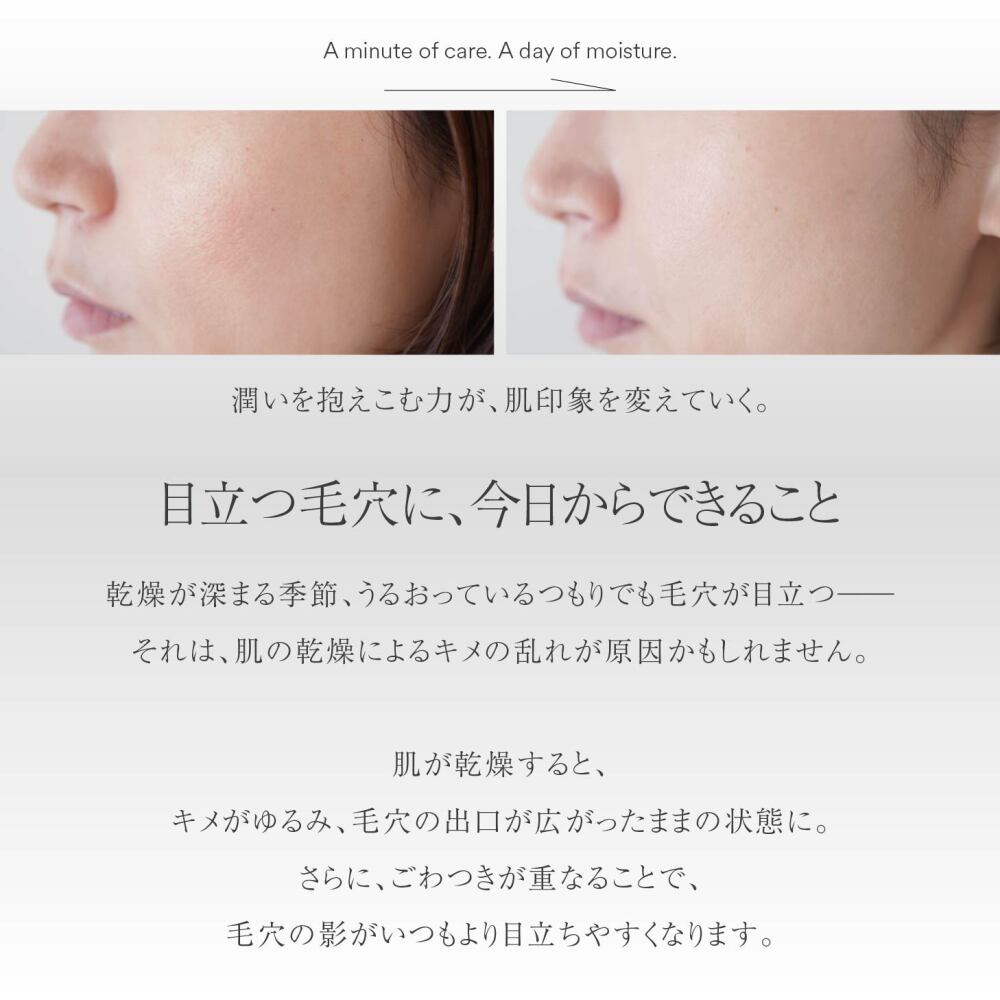 とろみのあるテクスチャーが角質層のすみずみまで穏やかに浸透し、潤いを届けます。少量でも、吸いつくようなもちもちの肌触りに。お手入れの最初である化粧水でしっかり保湿して肌を柔らげることで、潤いに満ちた輝かしい肌へと導きます。